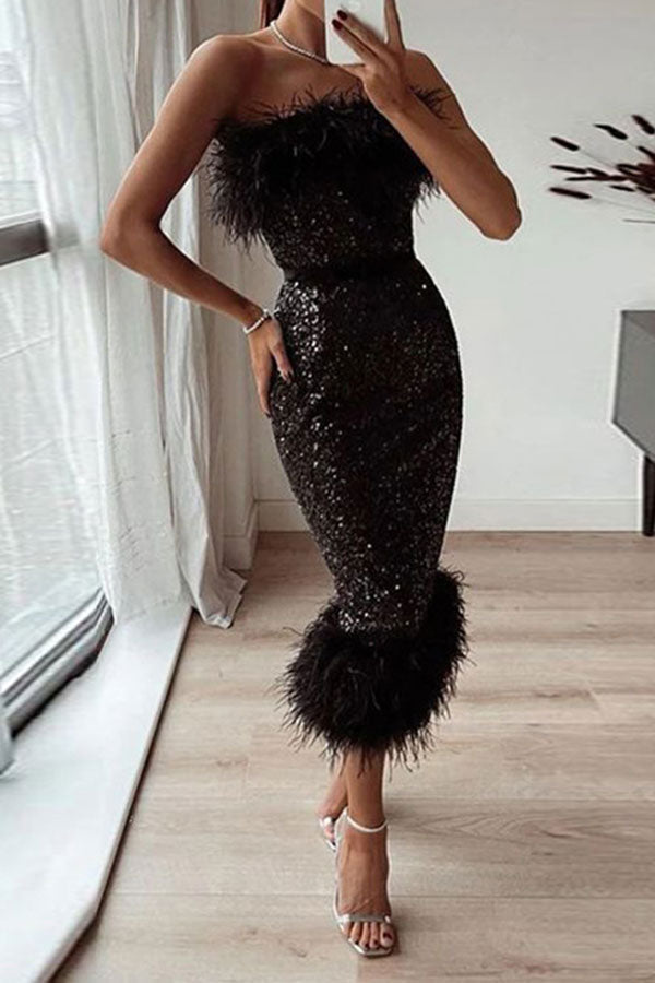 Feather Patchwork Glistening Sequined Midi Dress