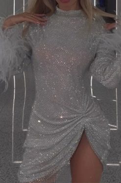 Feather Patchwork Modern Draped Fishnet Mini Dress